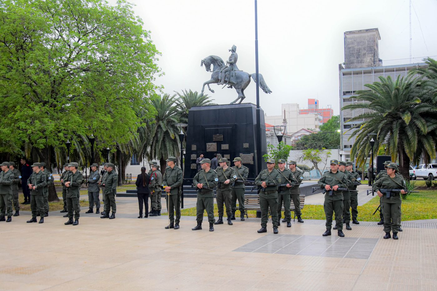 El acto tuvo lugar en el busto del general Martín Miguel de Güemes que se encuentra en plaza San Martín, y contó con la presencia del presidente del Diputado Nacional Gerardo Cipolini; el secretario de Gestión y Promoción Educativa Pedro Egea, el subsecretario de Gobierno Rafael Acuña; el Comandante General Antonio Leguizamon, jefe del Comando Región VIII de Gendarmería Nacional; el Comandante Mayor Valentin Otazo; el Comandante Principal Fabian Mielnichuk del Escuadrón 1 Roque Sáenz; Bomberos Voluntarios, Veteranos de Malvinas; autoridades de Policía Federal y diferentes Fuerzas de Seguridad y demás funcionarios municipales.