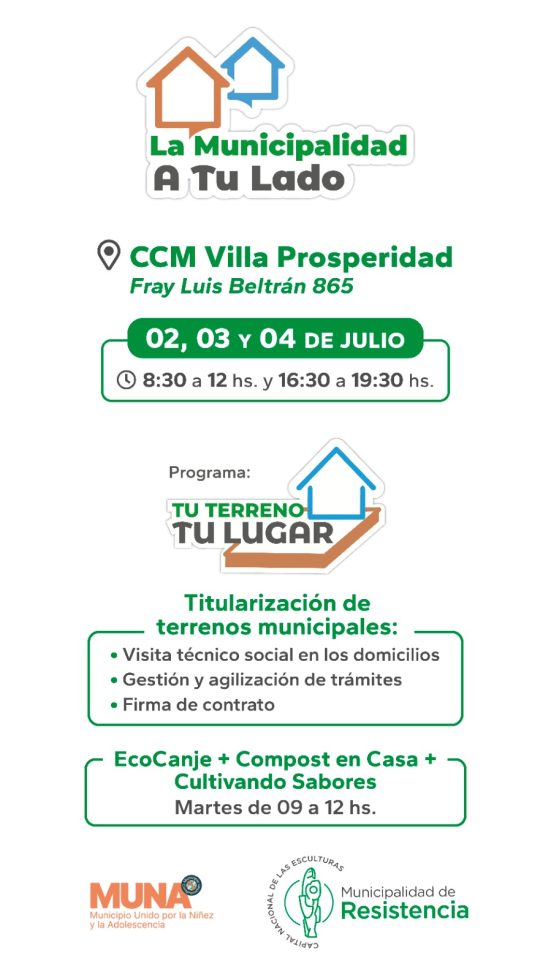 El programa “La Municipalidad a tu lado” estará desde este martes 2 de julio al jueves 4, en el Centro Comunitario de Villa Prosperidad, ubicado en Fray Luis Beltrán 865.