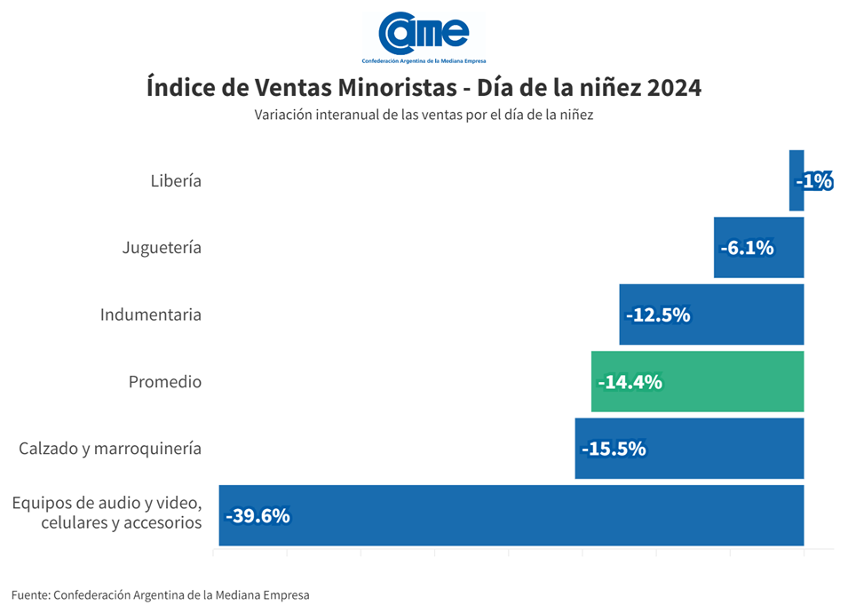 Las ventas minoristas pymes por el Día del Niño cayeron 14,4% frente a la misma fecha del año pasado, medidas a precios constantes. Fue una semana en la que las familias se orientaron a buscar productos económicos o en oferta. Se observó un consumo más cauteloso que el del año anterior, donde las prioridades se orientaron hacia lo esencial y funcional.