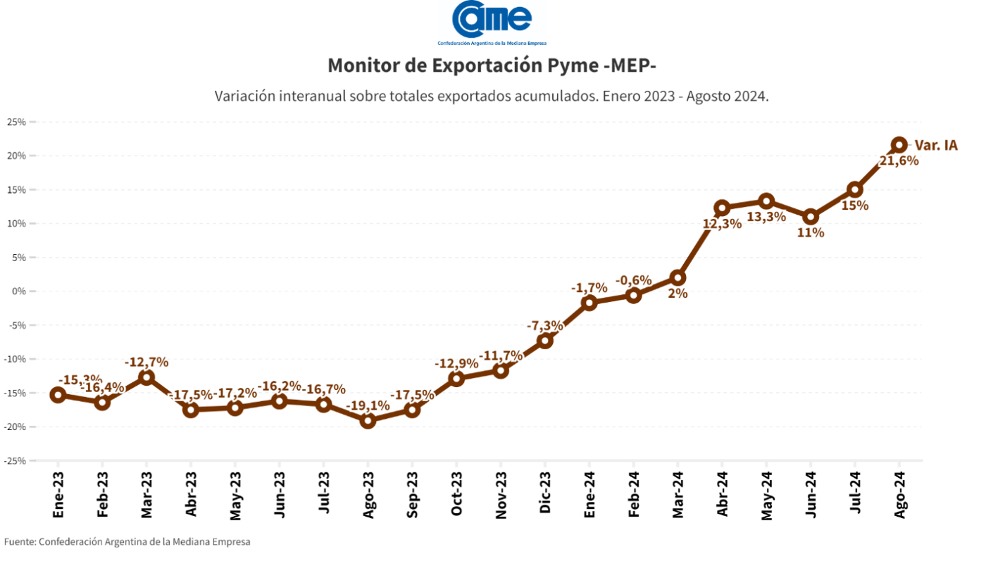 Así surge del Monitor de Exportación Pyme (MEP), un indicador elaborado por el sector de Estadísticas e Informes de la Confederación Argentina de la Mediana Empresa (CAME), para medir las exportaciones de las pequeñas y medianas empresas de la República Argentina, en base al monitoreo mensual de las operaciones de las empresas argentinas en el comercio exterior (se discrimina por condición pyme declarada ante la Secretaría de la Pequeña y Mediana Empresa, Emprendedores y Economía del Conocimiento, dependiente del Ministerio de Economía de la Nación).