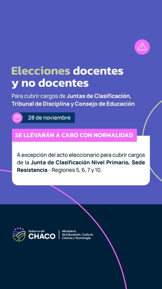 Este jueves 28 de noviembre se realizarán elecciones para elegir a los representantes docentes y no docentes en las Juntas de Clasificación, Tribunal de Disciplina y Consejo de Educación, excluyendo la Junta de Clasificación de Nivel Primario, Sede Resistencia, cuya elección está suspendida por una medida cautelar. Estas elecciones, convocadas por el Ministerio de Educación de la Provincia, buscan garantizar la participación democrática de los trabajadores de la educación y cumplir con el Estatuto del Docente.