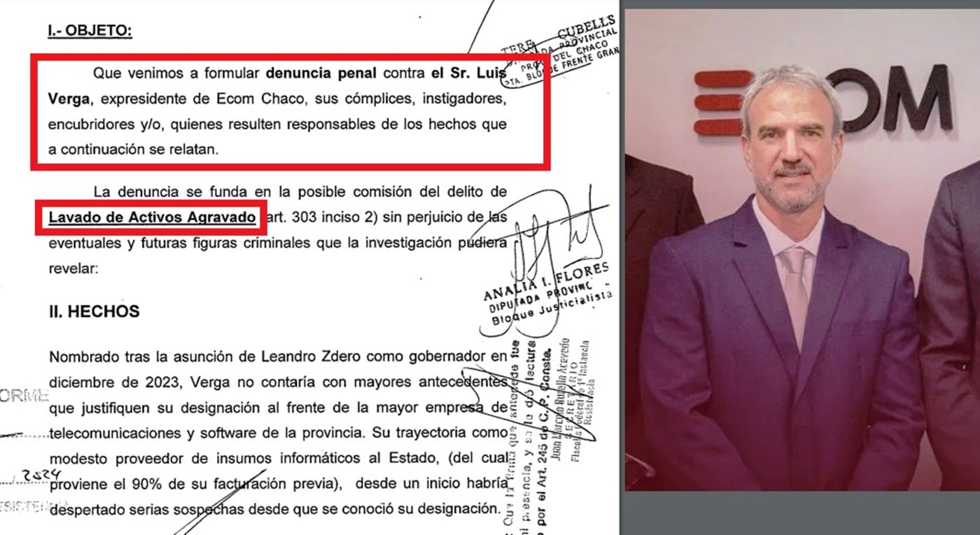 Este miércoles, diputados del Frente Chaqueño presentaron una denuncia ante la Fiscalía de Primera Instancia de Resistencia en la que acusan a Luis Verga y otros miembros del Directorio de ECOM Chaco S.A. por presunto esquema de lavado de activos.