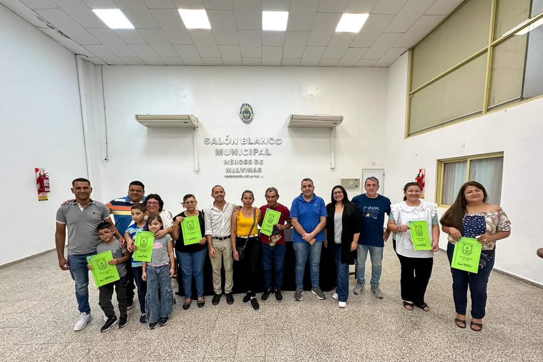 En un emotivo acto celebrado en el Salón Blanco del Municipio Héroes de Malvinas, se realizó la entrega de títulos de propiedad a familias de Presidencia de la Plaza. La ceremonia estuvo encabezada por el intendente Diego Bernachea, acompañado por los concejales Federico Lombardo, Carlos Diez y Hugo Lombardo, junto con la encargada del área de Tierras y Catastro, Grisel Tortella.
