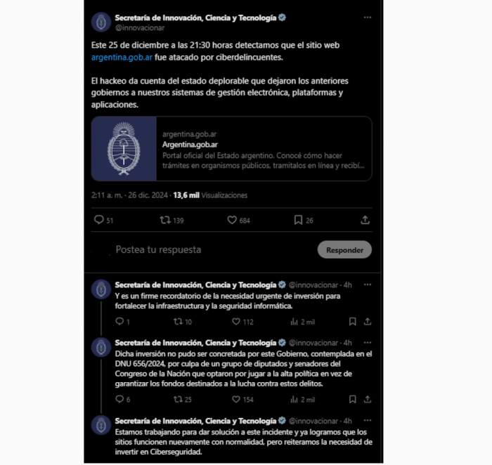 “El hackeo da cuenta del estado deplorable que dejaron los anteriores gobiernos a nuestros sistemas de gestión electrónica, plataformas y aplicaciones”, señalaron en el comunicado publicado en la red social X (exTwitter).