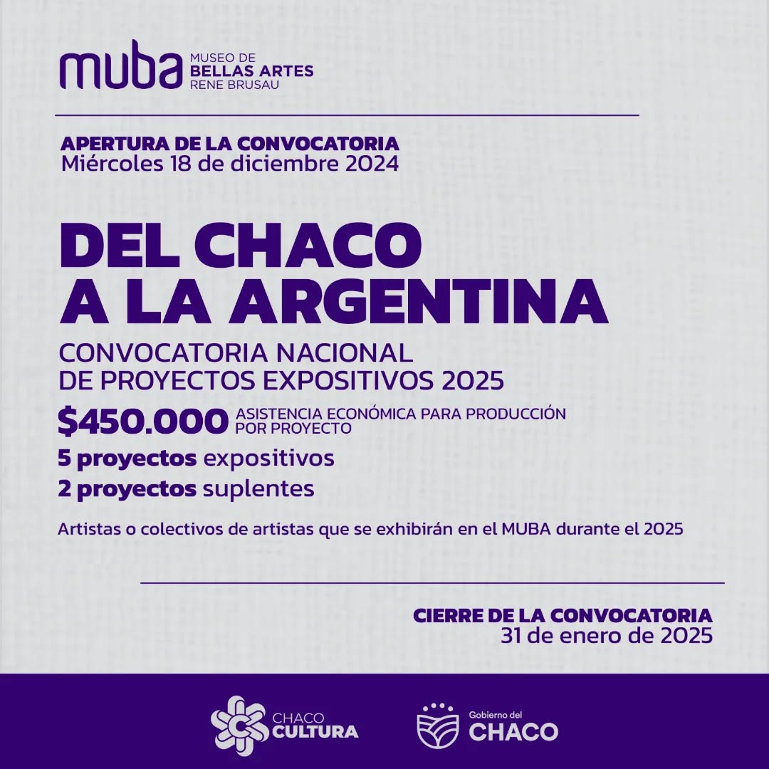 El Museo Provincial de Bellas Artes René Brusau (MUBA), dependiente del Instituto de Cultura del Chaco (ICCH), informa que hasta el viernes 31 de enero se encuentra abierta la Convocatoria de Proyectos Expositivos 2025. Esta convocatoria es abierta e incluye a artistas de todo el país.