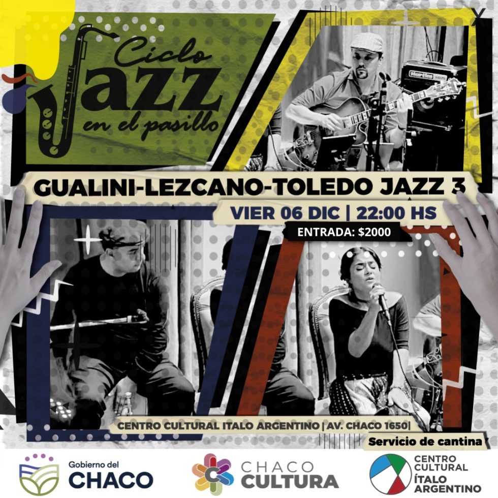 Este viernes 6 de diciembre a las 22 en el Centro Cultural Ítalo Argentino (Av. Chaco 1650), perteneciente al Instituto de Cultura del Chaco, será la 4° edición del ciclo Jazz en el Pasillo con tres figuras destacadas de la música local, Fer Gualini, Darío Lezcano y Marta Toledo.