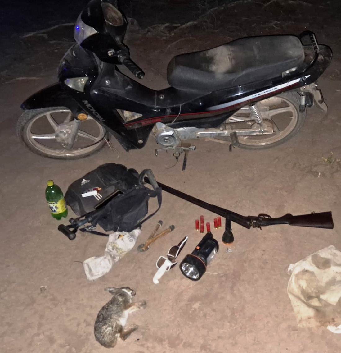 Los agentes verificaron lo que llevaban y descubrieron que tenían una escopeta calibre 16, varios cartuchos, un cuchillo, linternas y un animal carneado. Secuestraron todo y notificaron las actuaciones judiciales iniciadas por Infracción al Artículo 189° Bis del Código Penal Argentino y al artículo 277 del Código Penal Argentíno.