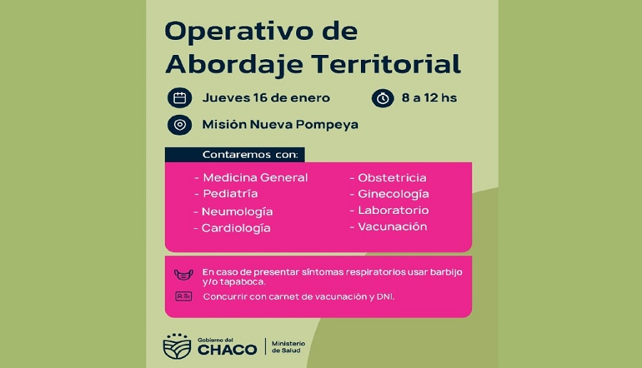 Este jueves 16 de enero el Ministerio de Salud realizará el primer Operativo de Abordaje Territorial de 2025. La cita será en el Hospital de Misión Nueva Pompeya en la Región Sanitaria V.