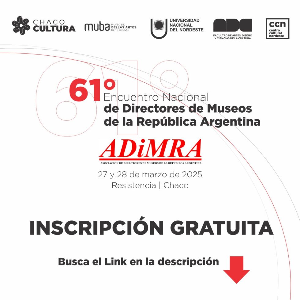 El Instituto de Cultura del Chaco comunica que se encuentra abierta la inscripción para el 61° Encuentro Nacional de Directores de Museos de la República Argentina que se realizará el jueves 27 y viernes 28 de marzo en la Facultad de Artes, Diseño y Ciencias de la Cultura de la UNNE (Av. Castelli 1300). La inscripción es libre y gratuita.