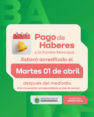 La Municipalidad de Barranqueras anunció que este martes 1 de abril estarán depositados los haberes de todos los trabajadores municipales.