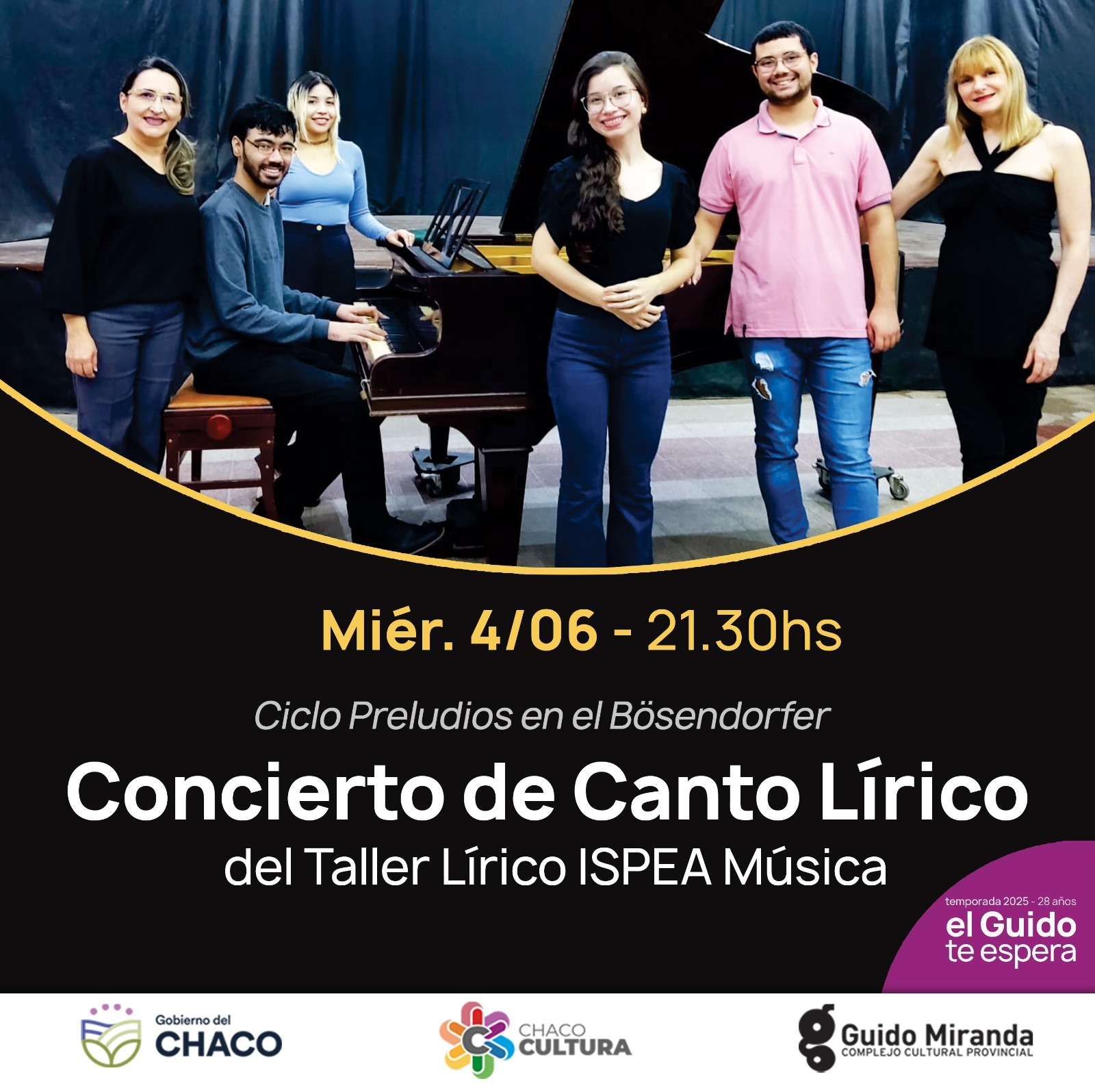 El miércoles 4 de junio a las 21.30, en el marco del ciclo «Preludios en el Bösendorfer” del Complejo Cultural Guido Miranda (Colón 164), se realizará un Concierto Lírico de cámara, a cargo de estudiantes y egresados del taller de Canto Lírico del ISPEA Música.
