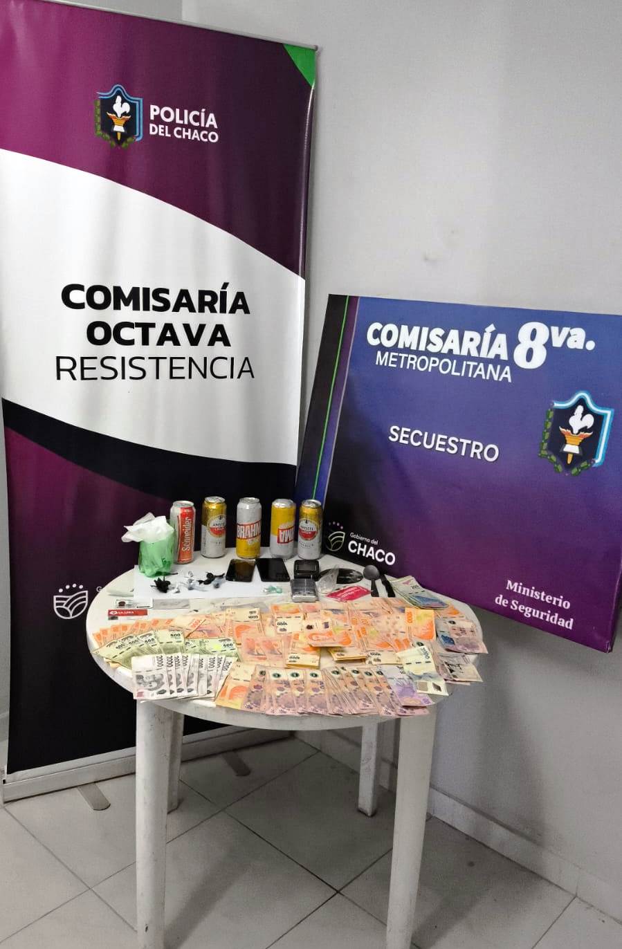 Los detenidos son tres hombres, uno de 27, 39 y 42 años y secuestraron 4 gramos de marihuana distribuidas en 10 bochitas, 1,2 gramos de cocaína, $110.650, una cuchara, un cuchillo, un vidrio redondo, bicarbonato, varios recortes de polietileno, cinco latas de cervezas y dos celulares.