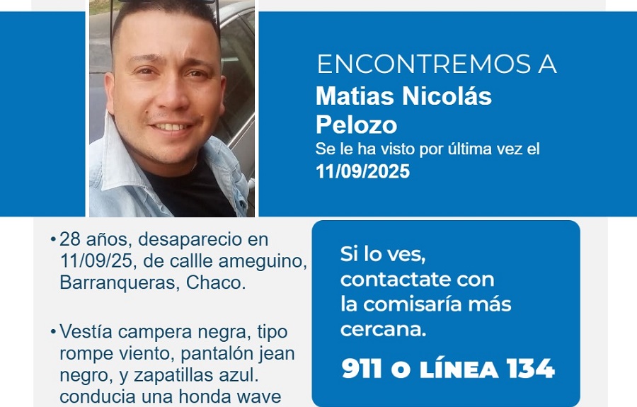 La Policía del Chaco en base a una denuncia registrada en Comisaría Segunda Barranqueras, solicita a la comunidad su valiosa colaboración de informar a la unidad policial más cercana cualquier información relacionada al paradero de Matias Nicolás Pelozo, de 28 años.