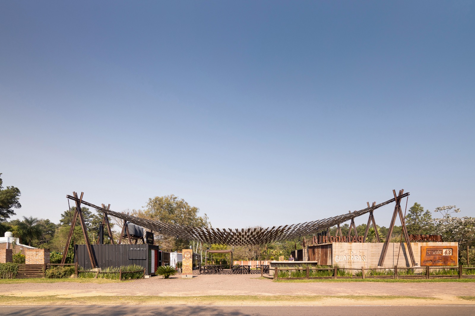 “Tras analizar el encargo y el sitio, observamos un proceso territorial significativo: en las últimas tres décadas, Santa Ana y la Ruta Provincial N°43 —que la conecta con Corrientes— han experimentado la fragmentación de parcelas rurales, antes destinadas a la producción minifundista familiar, para dar lugar a barrios cerrados. Este fenómeno redujo el acceso público a áreas de alto valor paisajístico. Frente a ello, nuestra propuesta buscó abrir un espacio de encuentro comunitario en un ámbito privado. Así, el proyecto se concibe como una gran plaza abierta al barrio y a la ciudad, bajo la idea de “urbanizar lo privado”, demostrando el potencial de ciertos emprendimientos para generar aportes urbanos y públicos. Desde lo tecnológico, la solución es sencilla: tres volúmenes fijos de hormigón que alojan puestos de comida, servicios y barra, acompañados por una gran pérgola que protege el patio de comidas del intenso sol litoraleño”.