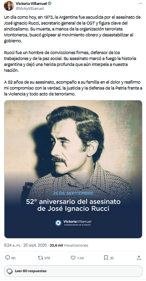 “Un día como hoy, en 1973, la Argentina fue sacudida por el asesinato de José Ignacio Rucci, secretario general de la CGT y figura clave del sindicalismo. Su muerte, a manos de la organización terrorista Montoneros, buscó golpear al movimiento obrero y desestabilizar al gobierno”, escribió Villarruel.