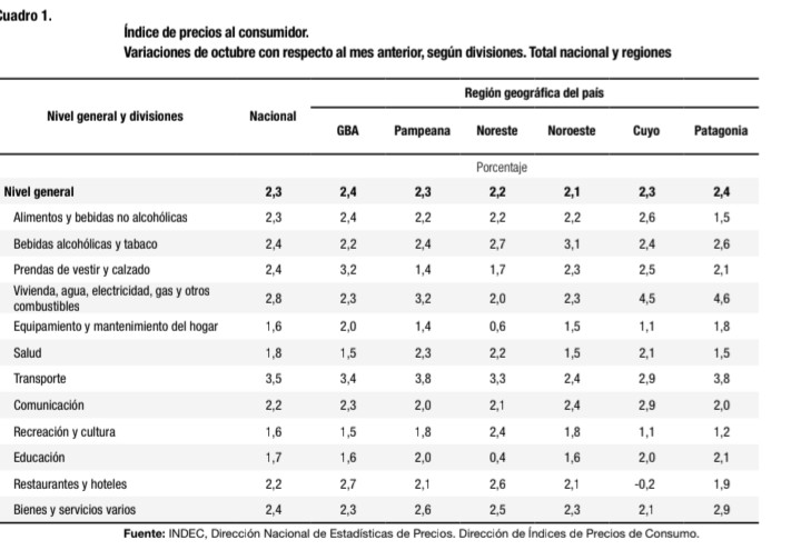 En la mencionada región argentina el Índice de Precios al Consumidor fue del 2,2%, y los detalles se pueden ver a continuación en el cuadro elaborado por el INDEC y que compartimos abajo.