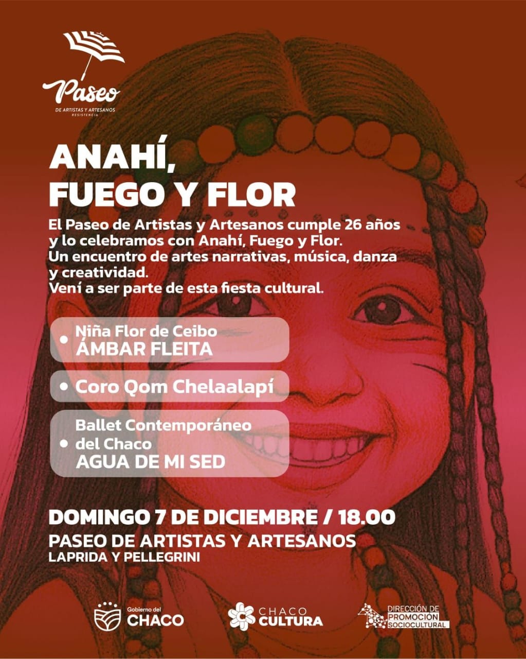 El domingo 7, desde las 18, el Paseo de Artistas y Artesanos (Laprida y Pellegrini), dependiente del Instituto de Cultura del Chaco (ICCh), celebrará su cumpleaños número 26 años con el show “Anahí, Fuego y Flor: un encuentro de arte, narrativas, creatividad y ritualidad”. La entrada es libre y gratuita.