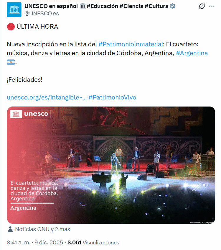 Con este reconocimiento, el cuarteto se suma al selecto grupo de expresiones culturales argentinas protegidas en el plano internacional, y confirma que su ritmo, nacido en los barrios y dueño de un sonido inconfundible, es ahora patrimonio del mundo.
