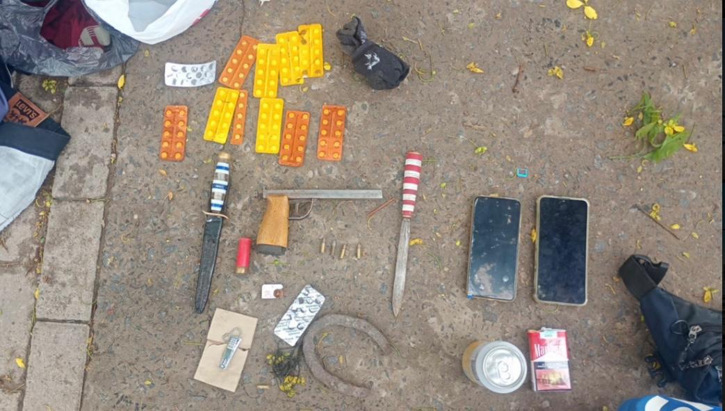 Al revisar la mochila, se secuestró un arma de fuego de fabricación casera tipo pistolón, cartuchos de distintos calibres, dos armas blancas, varios blíster de pastillas, teléfonos celulares y prendas de vestir, entre otros elementos.