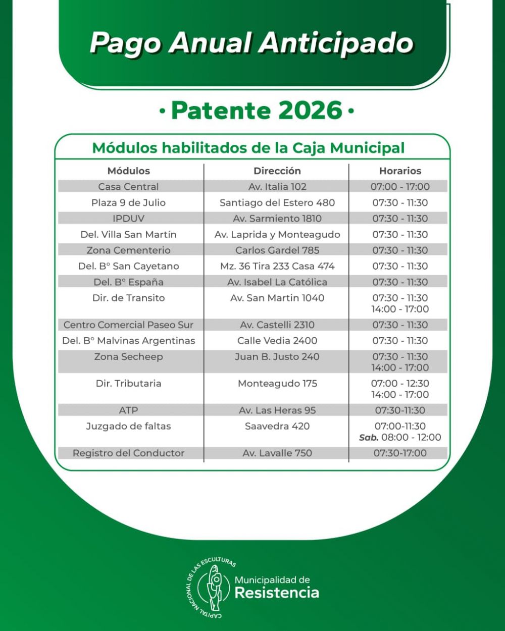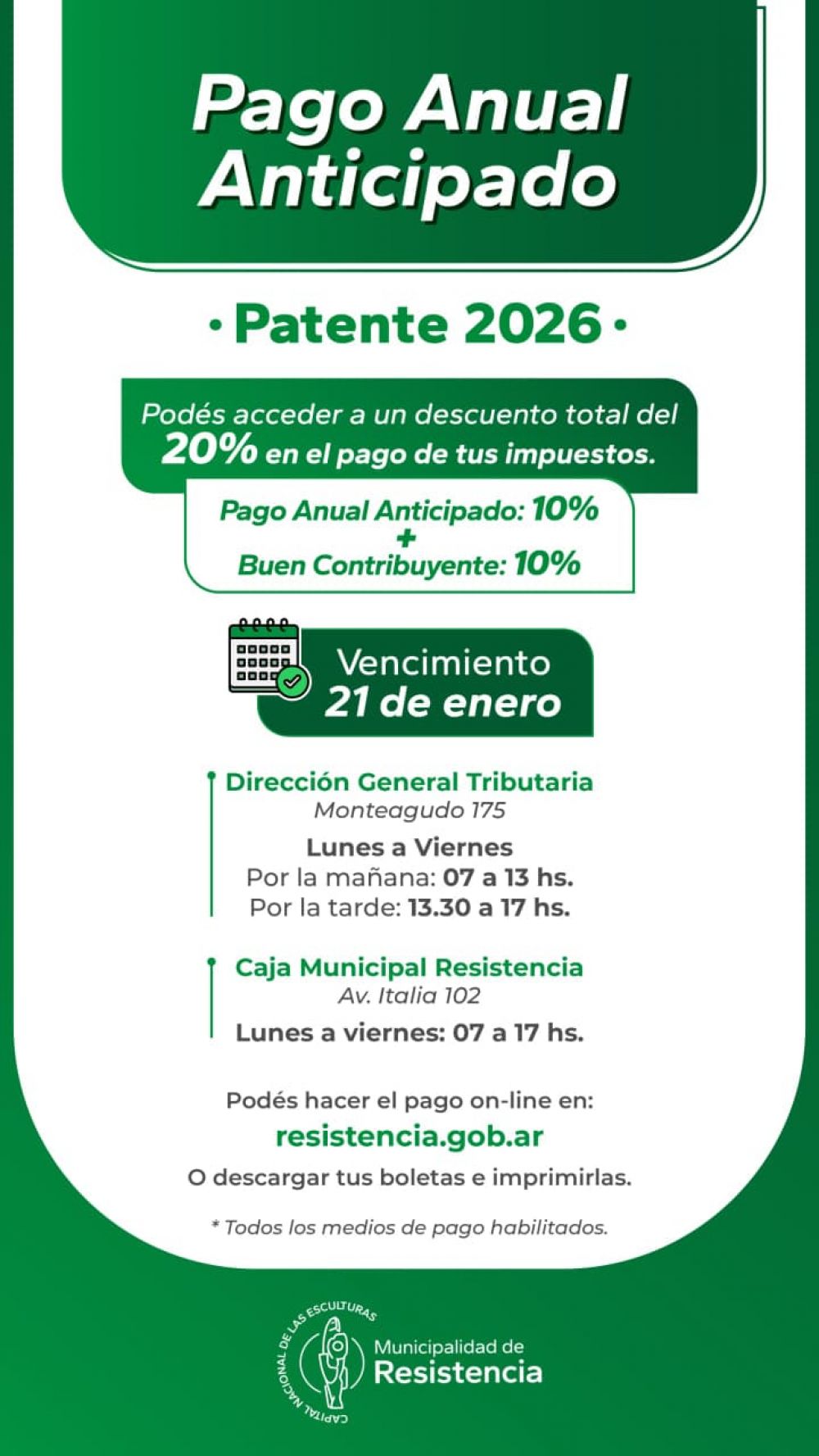 La Municipalidad de Resistencia anunció la apertura del pago anual anticipado de la patente automotor, con beneficios para quienes abonen en término y sean considerados buenos contribuyentes. Los vecinos podrán acceder a un descuento total de hasta el 20% y realizar el trámite de manera presencial o en línea hasta el 21 de enero.