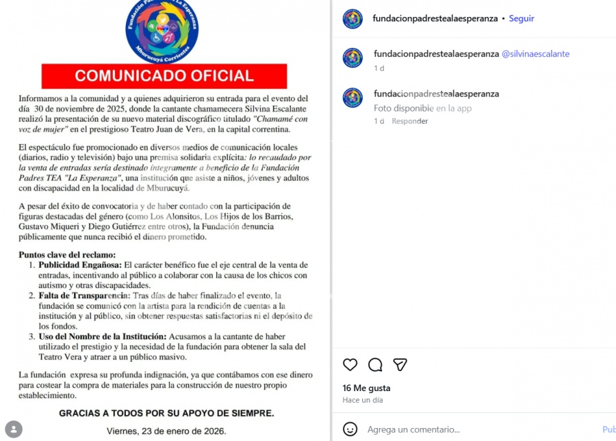 El pasado 23 de enero, la fundación emitió un comunicado en el que indicaban que no recibieron los fondos de lo recaudado en el evento protagonizado por la cantante y que tuvo varios invitados chamameceros.