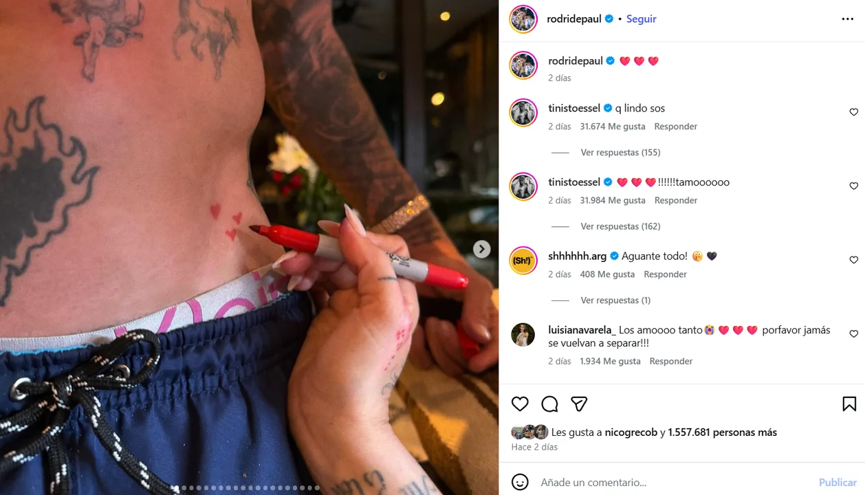 En una de las publicaciones, De Paul mostró un pequeño tatuaje que se realizó durante las vacaciones: se trata de un dibujo sencillo, con forma de corazón, que fue hecho por la propia Tini. De esta manera, el futbolista dejó atrás el hermetismo que durante meses rodeó a la relación y expresó públicamente su amor con una dedicatoria cargada de emoción.