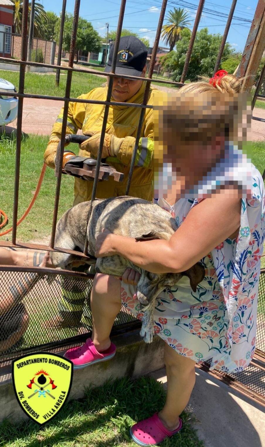 Personal de la División Bomberos de Villa Ángela rescató este jueves por la tarde a un perro que había quedado atrapado entre los barrotes de una reja, en la intersección de las calles Pasteur y Santiago del Estero.