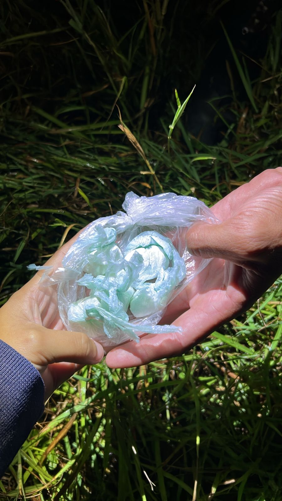 Al inspeccionar el elemento descartado, los uniformados hallaron un envoltorio de polietileno transparente que contenía en su interior cinco envoltorios de menor tamaño (denominados «bochas»). Estos almacenaban una sustancia blanquecina, tanto en forma compacta como disgregada.