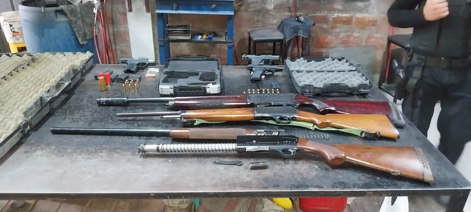 Posteriormente, los efectivos realizaron un registro del lugar y secuestraron varias armas de fuego: una carabina calibre .32, dos escopetas (calibres 12 y 20) y tres pistolas (calibres 9 mm, .380 y .22), además de municiones y cargadores.