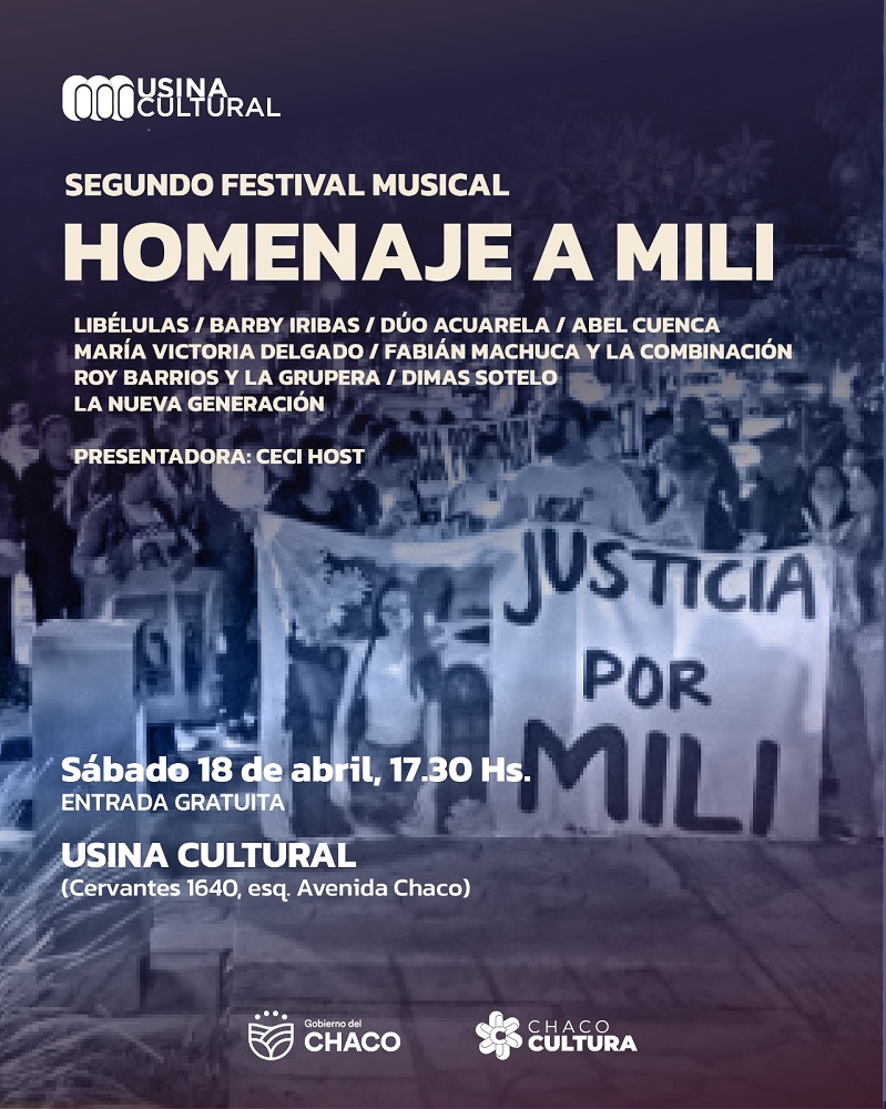 Este sábado 18 de abril, a partir de las 17.30, en la Usina Cultural (Cervantes 1640), dependiente del Instituto de Cultura del Chaco, se realizará el Segundo Festival Musical Homenaje a Mili. Se trata de un evento organizado por familiares y amigos de Milagros Belén Machuca, en conmemoración de la joven fallecida en un siniestro vial el año pasado y en pos del pedido de justicia en esta causa.
